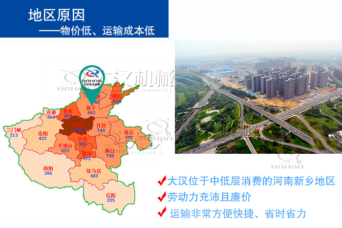 大漢公司位于新鄉大漢,設備的運輸非常方便快捷、省時省力,免除了40%以上的成本費用,且新鄉人力、物力資源豐富,生產設備花費的制造成本也相對減少10%左右,因此設備的總成本會降低25%,故而小型滾筒篩價格會比較低些。