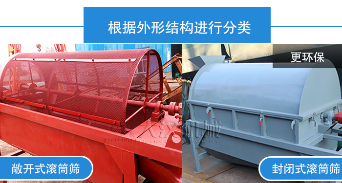 可以分為封閉式滾筒篩與敞開式(籠式滾筒篩),封閉式的滾筒篩可以保護周圍環境的干凈,同時也可以保護篩分的物料不受外界環境的影響。