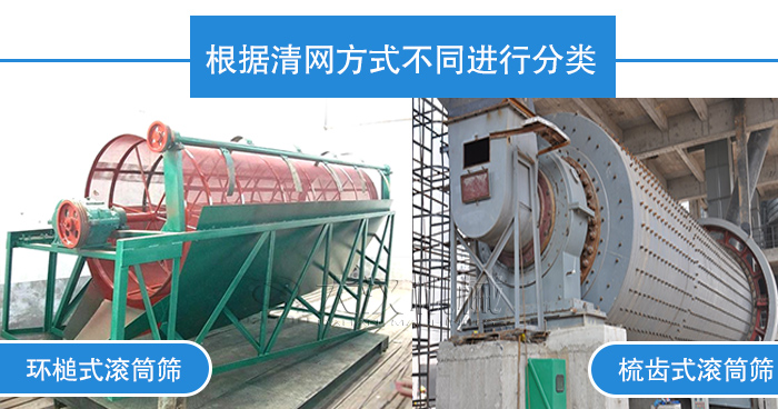 可以將滾筒篩分為滾刷式滾筒篩,環槌式滾筒篩以及梳齒式滾筒篩。滾筒篩的清網方式有多種,根據篩分的物料不同,選用的滾筒篩篩網材質不同,選用的滾筒篩的清網方式也就不同。