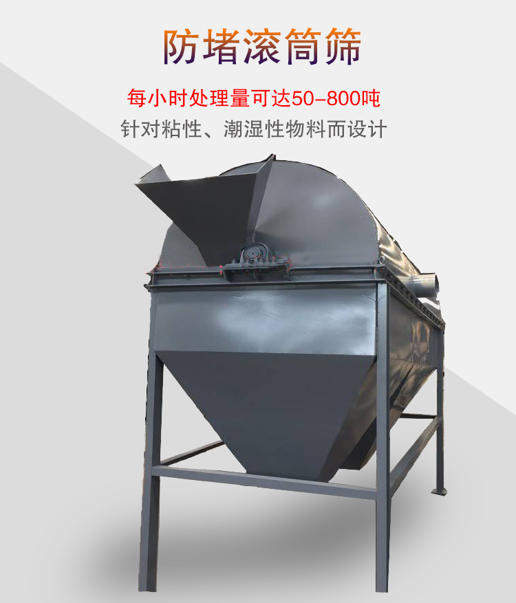 防堵滾筒篩主要是針對(duì)粘性、潮濕性物料而設(shè)計(jì)的一種滾筒篩,排除了普通振動(dòng)篩在篩分物料時(shí)出現(xiàn)的篩孔堵塞問(wèn)題,提高了篩分效率。