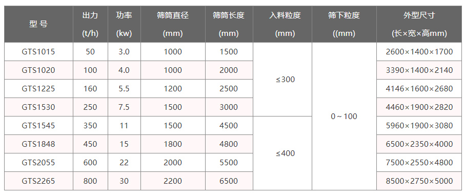 當(dāng)物料進(jìn)入滾筒裝置后,由于滾筒裝置的傾斜與轉(zhuǎn)動(dòng),使篩面上的物料翻轉(zhuǎn)與滾動(dòng),使合格物料(篩下產(chǎn)品)經(jīng)滾筒后端底部的出料口排出,不合格的物料(篩上產(chǎn)品)經(jīng)滾筒尾部的排料口排出。由于物料在滾筒內(nèi)的翻轉(zhuǎn)、滾動(dòng),使卡在篩孔中的物料可被彈出,防止篩孔堵塞。
