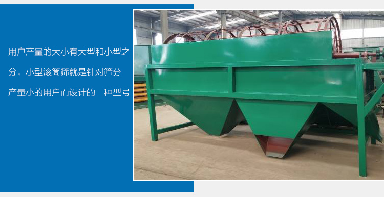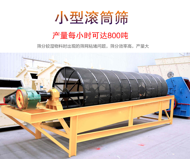 小型滾筒篩利用機械方法,通過數(shù)片并列的篩條構成篩孔并形成篩面。篩筒旋轉利用物料的自重進行篩分,破碎的石料進入滾筒后,靠滾筒旋轉的離心力及跳汰作用來篩分物料。通過不同網(wǎng)目的篩網(wǎng)逐一篩出。不同規(guī)格的石料篩出后經(jīng)漏斗落入皮帶機送至成品料場。靠滾筒旋轉的離心力及跳汰作用來篩分物料,通過不同網(wǎng)目的的篩網(wǎng)逐漸被篩出。