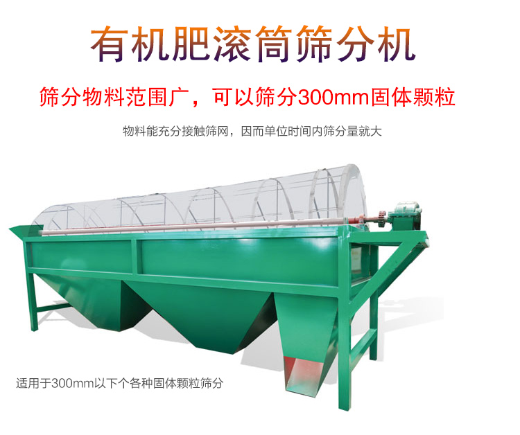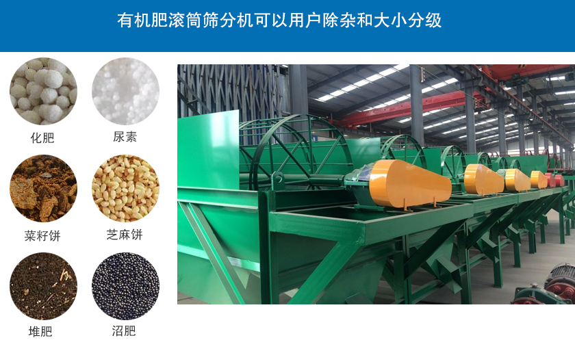 有機肥滾筒篩分機可以用戶除雜和大小分級,主要用于化肥、尿素、菜籽餅、芝麻餅、堆肥、沼肥等各種有機肥料的處理。