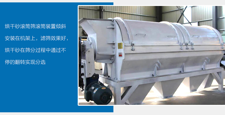 烘干砂滾筒篩是專門針對用于對烘干沙進(jìn)行分選的一種設(shè)備,一般用在大中型采石場使用。烘干砂滾筒篩滾筒裝置傾斜安裝在機架上,濾篩效果好,烘干砂在篩分過程中通過不停的翻轉(zhuǎn)實現(xiàn)分選,不易堵塞,篩下產(chǎn)品為200mm,中間20-40mm,細(xì)至5mm以下,筒內(nèi)安裝有梳型清篩裝置,可以對筒內(nèi)進(jìn)行清潔作用,可防止物料堵塞。